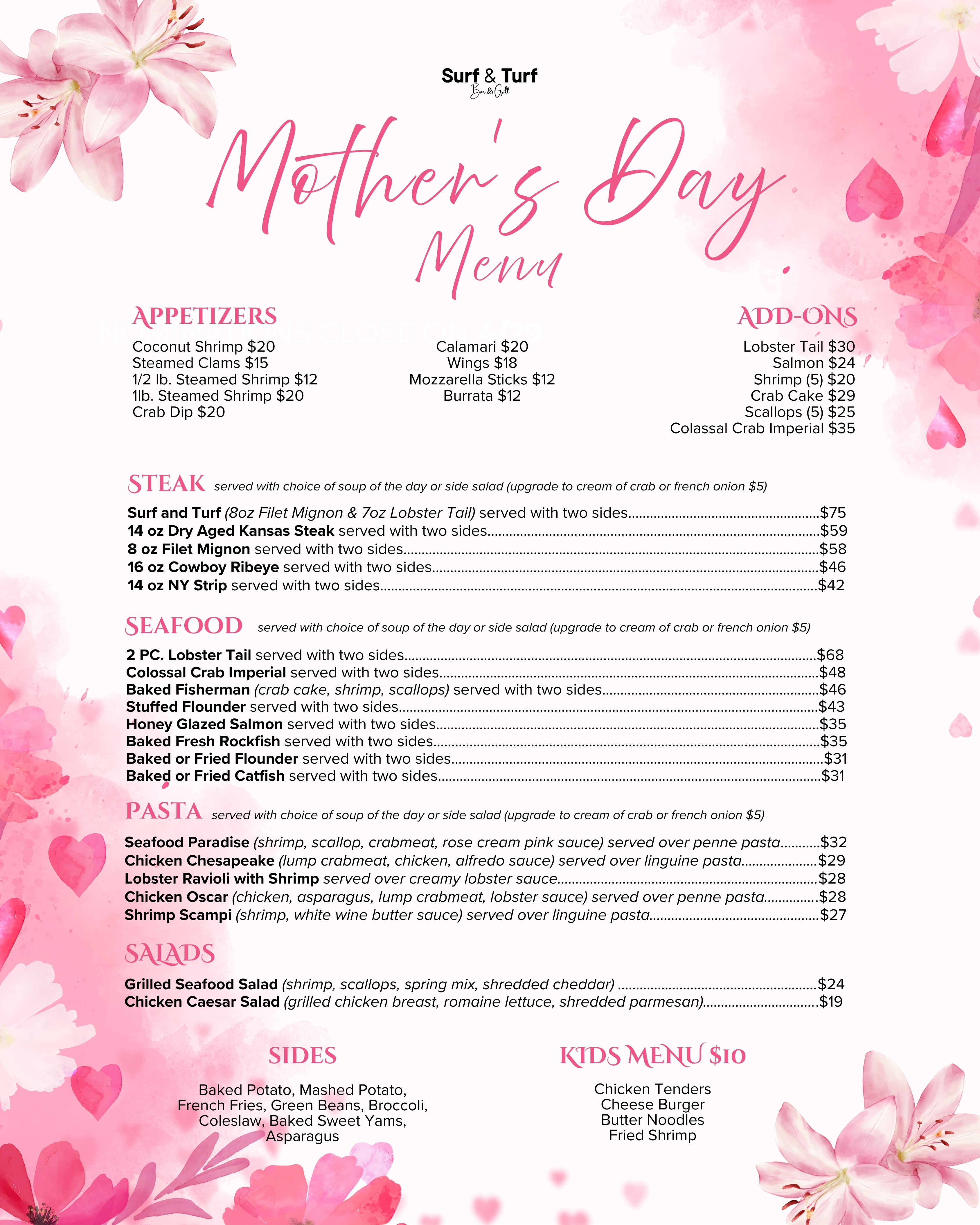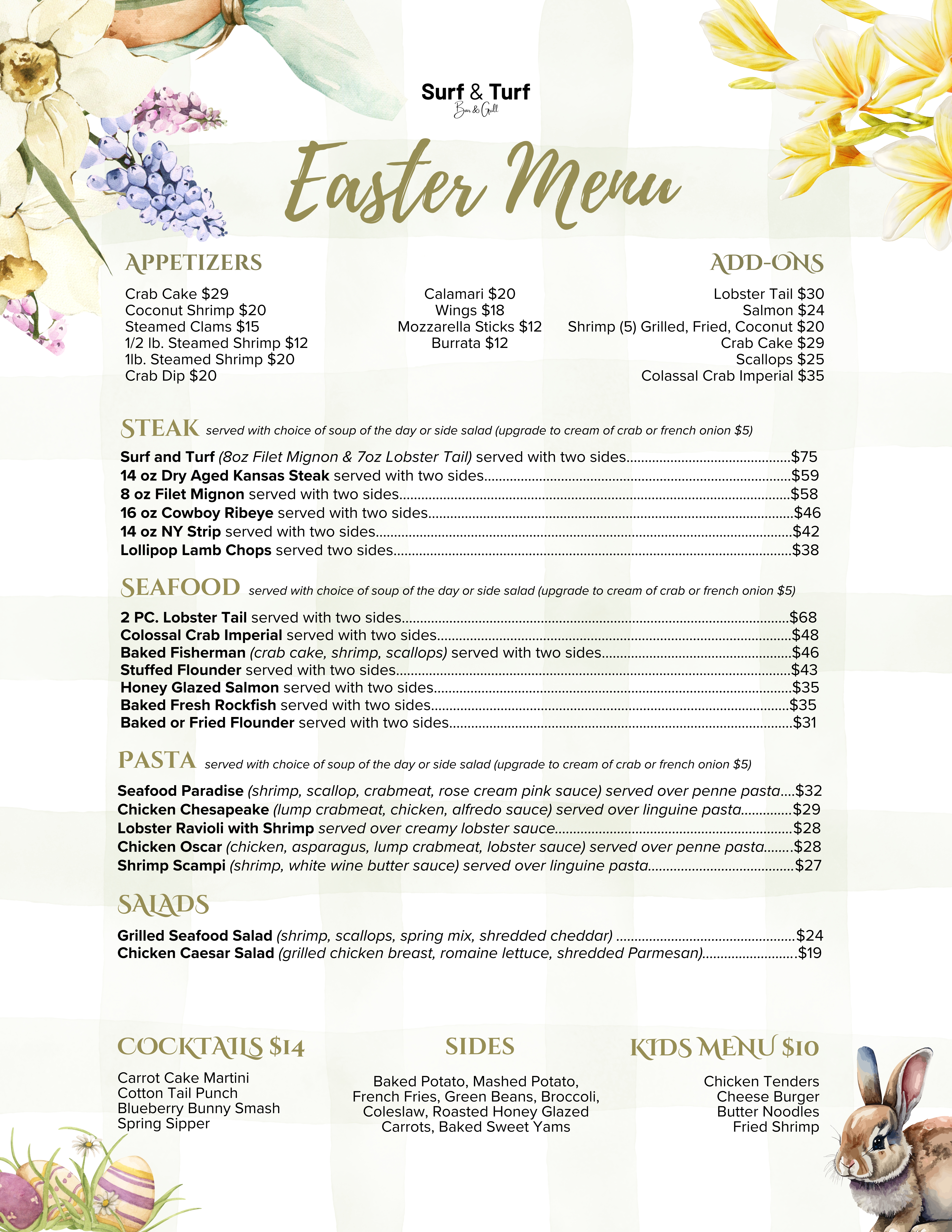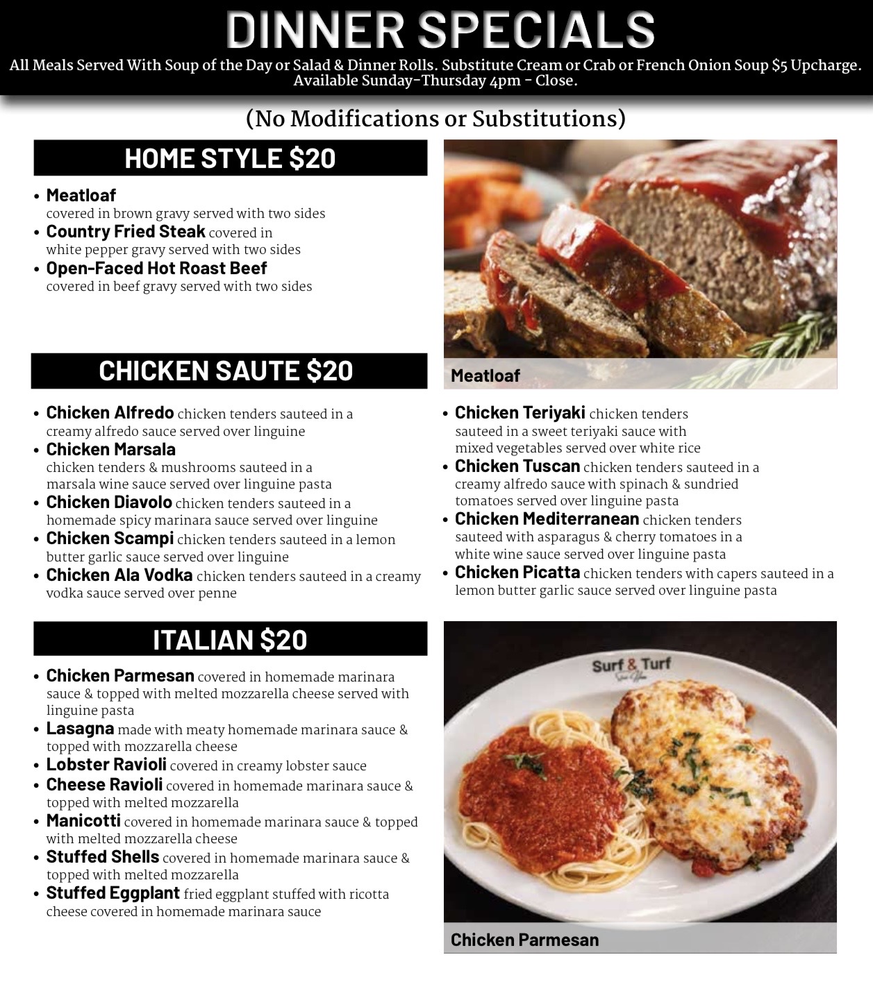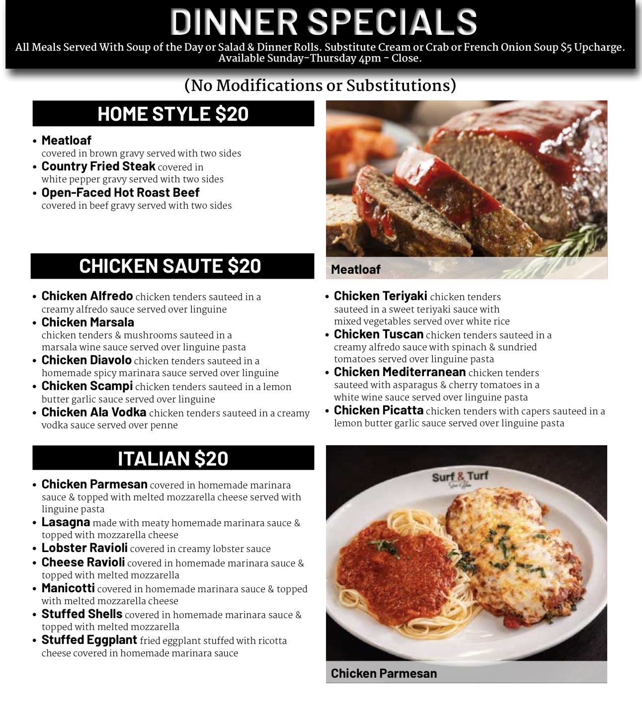 I don't normally leave reviews but I must say to have the owner of the restaurant bring me my food himself says a lot about the hard work behind him . The food was amazing I had the Italian chicken the color of the bright red peppers and the green spinach and mushrooms just delicious. Thank you so much Surf &Turf steakhouse